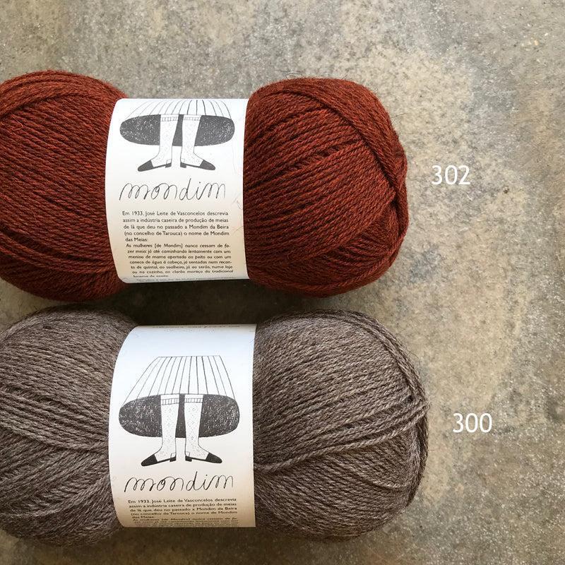 Mondim is a non-superwash fingering weight yarn made from fine Portuguese wool. It is named after a Portuguese village once famous for its sock knitting cottage industry. Shades 100 and 300 are natural (not dyed). Most batches of Mondim are exclusively made from the wool of native Campania sheep.